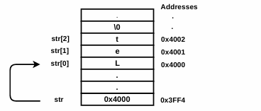 The string name str is a pointer variable that points to the first character in the string (in other words, it points to the base address of the character array). The following diagram shows how these characters reside in memory: