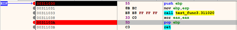 To demonstrate function tracing, consider the program shown in the following screenshot. In this program, the eip is pointing to the first instruction, the breakpoint is set at the fifth instruction (to stop tracing at this point), and the third instruction calls a function at 0x311020. We can use function tracing to determine what other functions are called by the function (0x311020):
