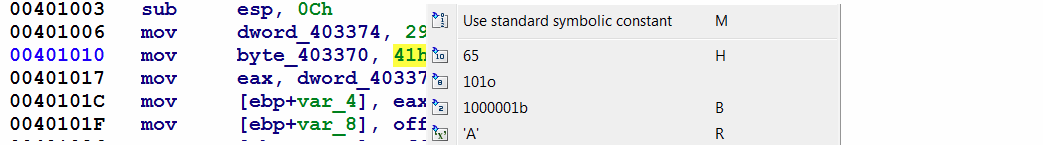 At ➋, and ➌ in the preceding listing, the operands (29h and 41h) are represented as hexadecimal constant values, whereas in the source code, we used the decimal value 41 and the character 'A'. IDA gives you the ability to reformat constant values as a decimal, octal, or binary values. If the constant falls within the ASCII printable range, then you can also format the constant value as a character. For example, to change the format of 41h, right-click on the constant value (41h), after which you will be presented with different options, as shown in the following screenshot. Choose the ones that suit your needs: