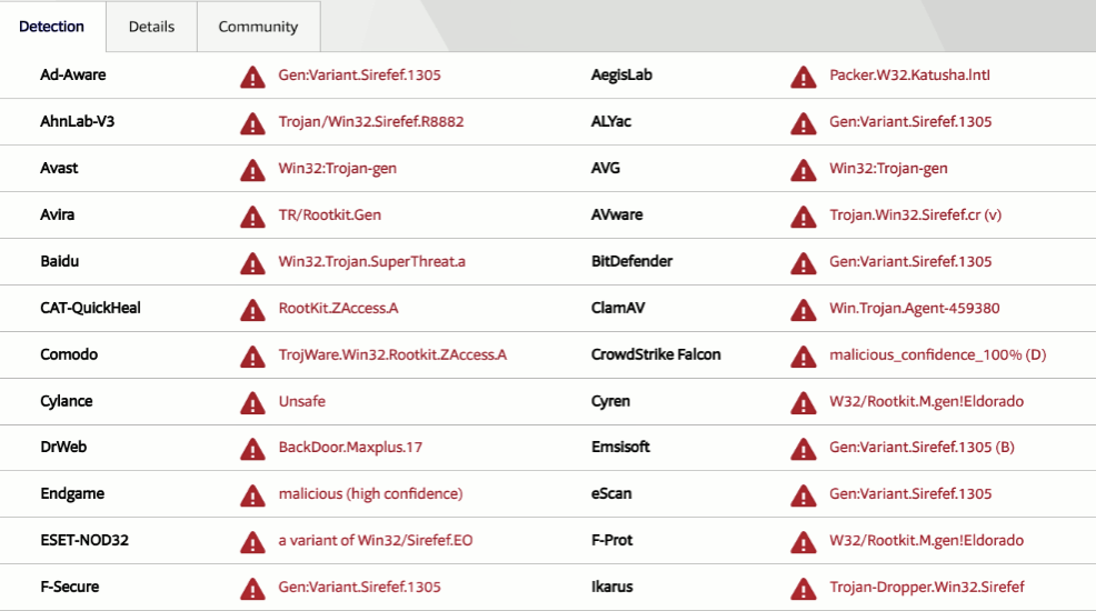 To confirm that the dumped module is malicious, it was submitted to VirusTotal. The results from AV vendors confirm it to be the ZeroAccess Rootkit (also known as Sirefef):