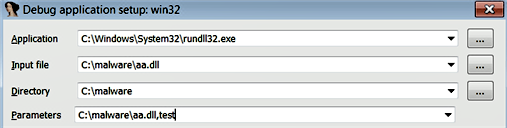 After you have set the breakpoint on the desired address (where you want the execution to pause), select the debugger via Debugger | Select debugger | Local Win32 debugger (or Debugger | Select debugger | Local Windows debugger) and click on OK. Next, select Debugger | Process options, which will bring up the dialog shown in the following screenshot. In the Application field, enter the full path to the executable that is used to load the DLL (rundll32.exe). In the Input file field, enter the full path to the DLL that you wish to debug, and in the Parameters field, enter the command-line arguments to pass to rundll32.exe, and click on OK. Now, you can run the program to reach the breakpoint, after which you can debug it, as you would debug any other program. The arguments that you pass to rundll32.exe should have the correct syntax to successfully debug the DLL (refer to the Working of rundll32.exe section in Chapter 3, Dynamic Analysis). A point to note is that rundll32.exe can also be used to execute a 64-bit DLL, in the same manner: