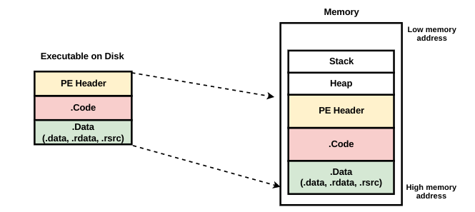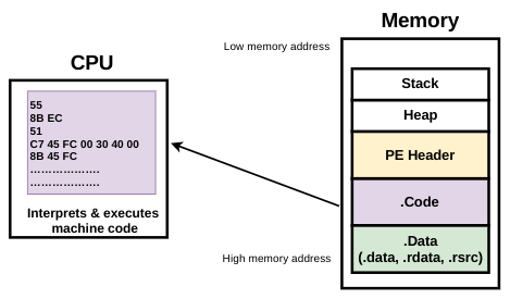 In the previous section, we examined the structure of the executable on the disk. Let's try to understand what happens when an executable is loaded into the memory. When the executable is double-clicked, a process memory is allocated by the operating system, and the executable is loaded into the allocated memory by the operating system loader. The following simplified memory layout should help you to visualize the concept; note that the structure of the executable on the disk is similar to the structure of the executable in the memory:
