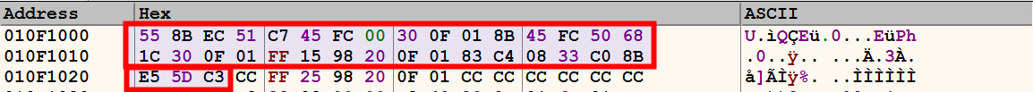 Examining the memory address of the .text section at 0x010F1000 displays the sequence of bytes, which is the machine code.
