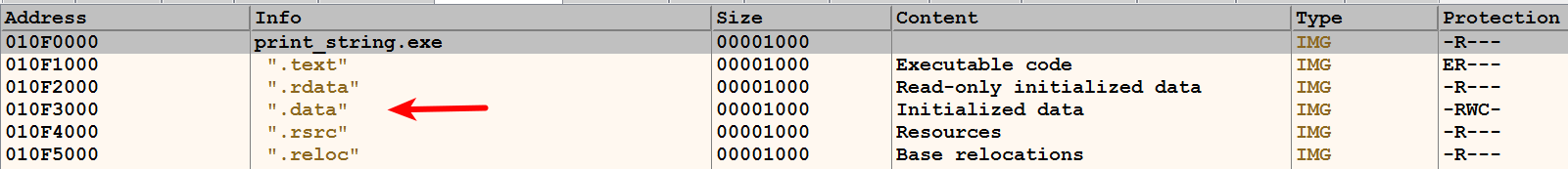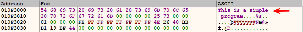 Examining the memory address of the .data section at 0x010F3000 displays the string This is a simple program.