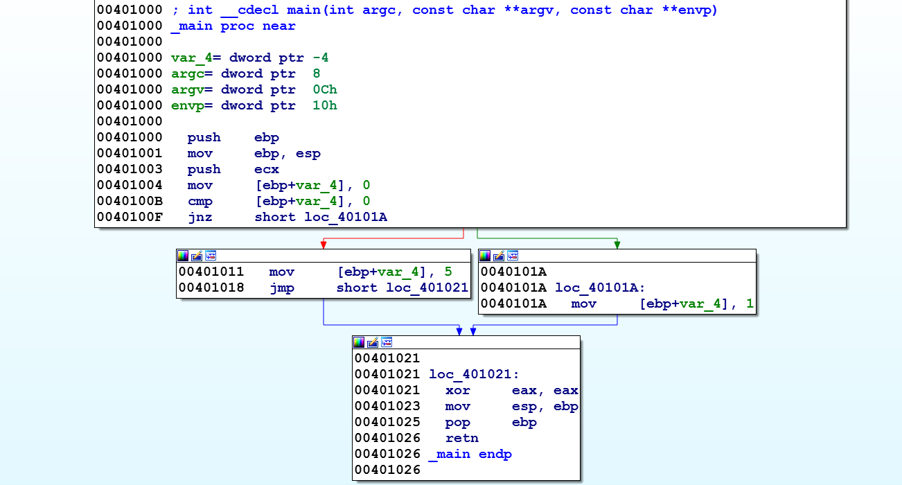The following screenshot shows the disassembly of the main function in the graph view mode. Notice the conditional check at the addresses 0x0040100B and 0x0040100F. If the condition is true, then the control is transferred to the address 0x0040101A (indicated by a green arrow), and if the condition is false, the control gets transferred to 0x00401011 (indicated by a red arrow). In other words, the green arrow indicates jump and the red arrow indicates the normal flow: