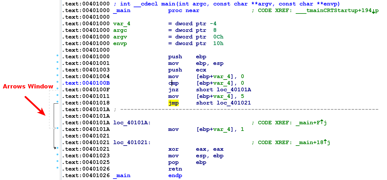 In the text view mode, the entire disassembly is presented in a linear fashion. The following screenshot shows the text view of the same program; the virtual addresses are displayed by default, in the <section name>:<virtual address> format. The left-hand portion of the text view window is called the arrows window; it is used to indicate the program's nonlinear flow. The dashed arrows represent conditional jumps, the solid arrows indicate unconditional jumps, and the backward arrows (arrows facing up) indicate loops: