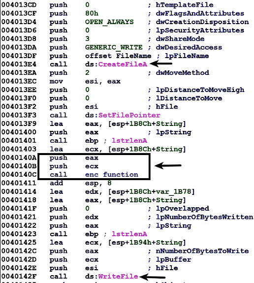 Examining the enc_function shows that the malware uses single byte XOR. It reads each character from the data buffer and encodes with a key of 0x5A, as shown here. In the following XOR loop, the edx register points to the data buffer, the esi register contains the length of the buffer, and the ecx register acts as an index into the data buffer that is incremented at the end of the loop, and loop is continued as long as the index value (ecx) is less than the length of the buffer (esi):