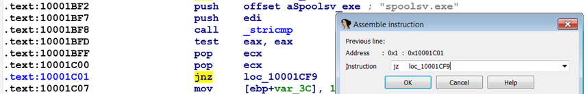 In the previous example, the TDSS rootkit DLL performed a check to see if it is running under spoolsv.exe. We modified the bytes in the program so that the DLL can run under notepad.exe instead of spoolsv.exe. What if you wanted to reverse the logic so that DLL can run under any process (other than spoolsv.exe)? To do that, we can change the jnz instruction to jz by selecting Edit | Patch program | Assemble, as shown in the following screenshot. This will reverse the logic and cause the program to return from the function without exhibiting any behavior when the DLL is running under spoolsv.exe. Whereas when the DLL is running under any other process, it exhibits malicious behavior. After changing the instructions, when you click on OK, the instruction is assembled but the dialog remains open, prompting you to assemble another instruction at the next address. If you do not have any more instructions to assemble, you can click the Cancel button. To make the changes to the original file, select Edit | Patch program | Apply patches to input file and follow the steps mentioned previously: