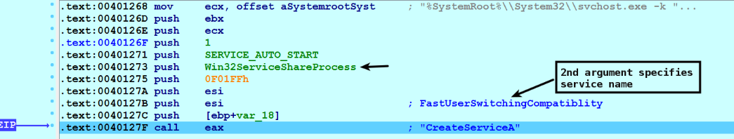 It then opens a handle to the service control manager using the OpenScManager() API and creates a service of type Win32ShareProcess by calling the CreateService() API. The second argument specifies the name of the service, which in this case is FastUserSwitchingCompatiblity: