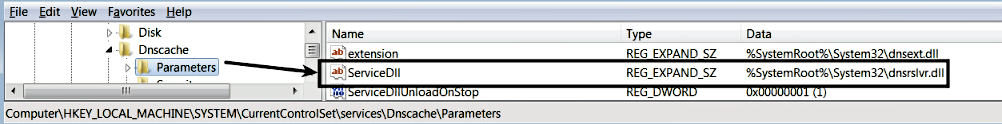 Let's now look at an example of the Win32ShareProcess service. The Dnsclient service has a service name of Dnscache, and code for the service is implemented in the DLL. When a service is implemented as a DLL (service DLL), the ImagePath registry value will typically contain the path to the svchost.exe (because that is the process that loads the Service DLL). To determine the DLL that is associated with the service, you will have to look at the ServiceDLL value, which is present under the HKEY_LOCAL_MACHINE\SYSTEM\CurrentControlSet\services\<service name>\Parameters subkey. The following screenshot shows the DLL (dnsrslvr.dll) associated with the Dnsclient service; this DLL gets loaded by the generic host process svchost.exe: