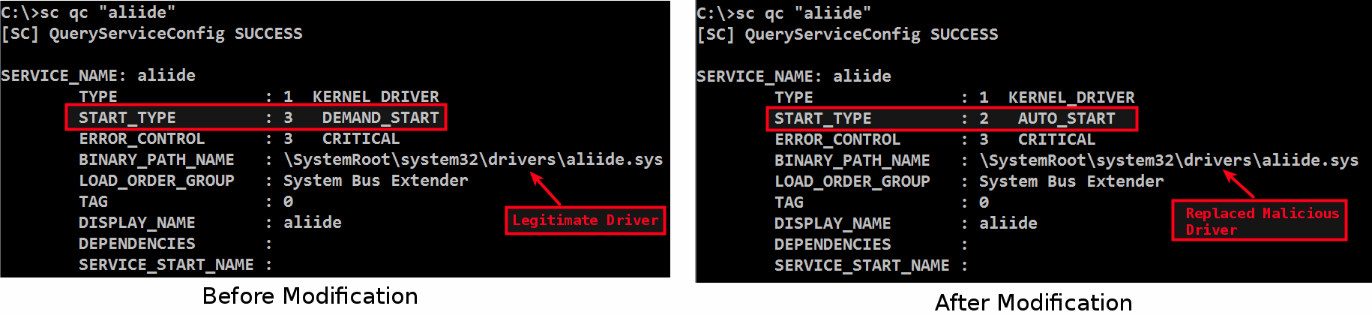 The following screenshot shows the service configuration of the aliide service before and after modification. For a detailed analysis of the BlackEnergy3 big dropper, read the author's blog post here at: https://cysinfo.com/blackout-memory-analysis-of-blackenergy-big-dropper/: