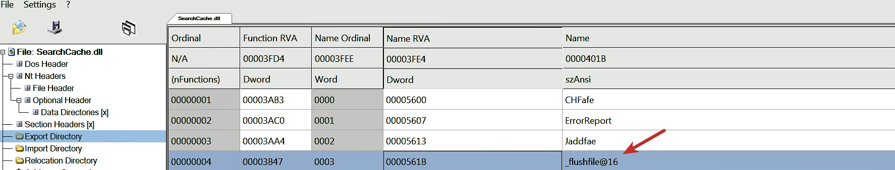The DLL (SearchCache.dll) consists of an export function, _flushfile@16, whose functionality is to delete a file. This export function accepts an argument, which is the file to delete: