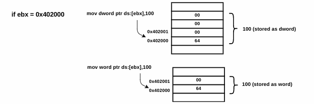 mov word ptr [ebx], 100 ; moves a word 100 into the address specified by ebx