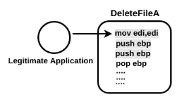 To help you understand, let's suppose that an attacker wants to hook the DeleteFileA() function call made by a legitimate application. Normally, when the legitimate application's thread encounters the call to DeleteFileA(), the thread starts executing from the start of the DeleteFileA() function, as shown here: