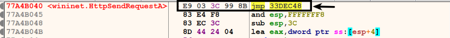 After injecting the executable, HttpSendRequestA() is hooked to redirect the program control to one of the malicious functions within the injected executable. Before we look at the hooked function, let's look at the first few bytes of the legitimate HttpSendRequestA() function (shown here):