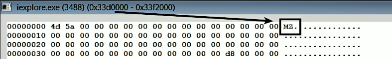 With an understanding of inline hooking, let's take a look at an example of malware (Zeus Bot) using this technique. Zeus bot hooks various API functions; one of them is the HttpSendRequestA() in Internet Explorer (iexplore.exe). By hooking this function, the malware can extract credentials from the POST payload. Before hooking, the malicious executable (containing various functions) is injected into the address space of Internet Explorer. The following screenshot shows the address 0x33D0000, where the executable is injected: