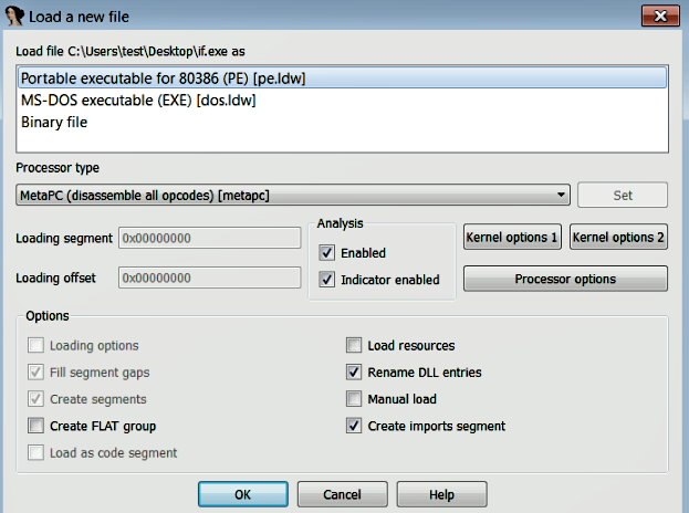 The file that you give to IDA will be loaded into the memory (IDA acts like a Windows loader). To load the file into the memory, IDA determines the best possible loaders, and from the file header, it determines the processor type that should be used during the disassembly process. After you select the file, IDA shows the loading dialog (as shown in the following screenshot). From the screenshot, it can be seen that IDA determined the appropriate loaders (pe.ldw and dos.ldw) and the processor type. The Binary file option (if you are using the IDA demo version, you will not see this option) is used by the IDA to load the files that it does not recognize. You will normally use this option when you are dealing with a shellcode. By default, IDA does not load the PE headers and the resource section in the disassembly. By using the manual load checkbox option, you can manually specify the base address where the executable has to be loaded, and IDA will prompt you on whether you want to load each section, including the PE headers: