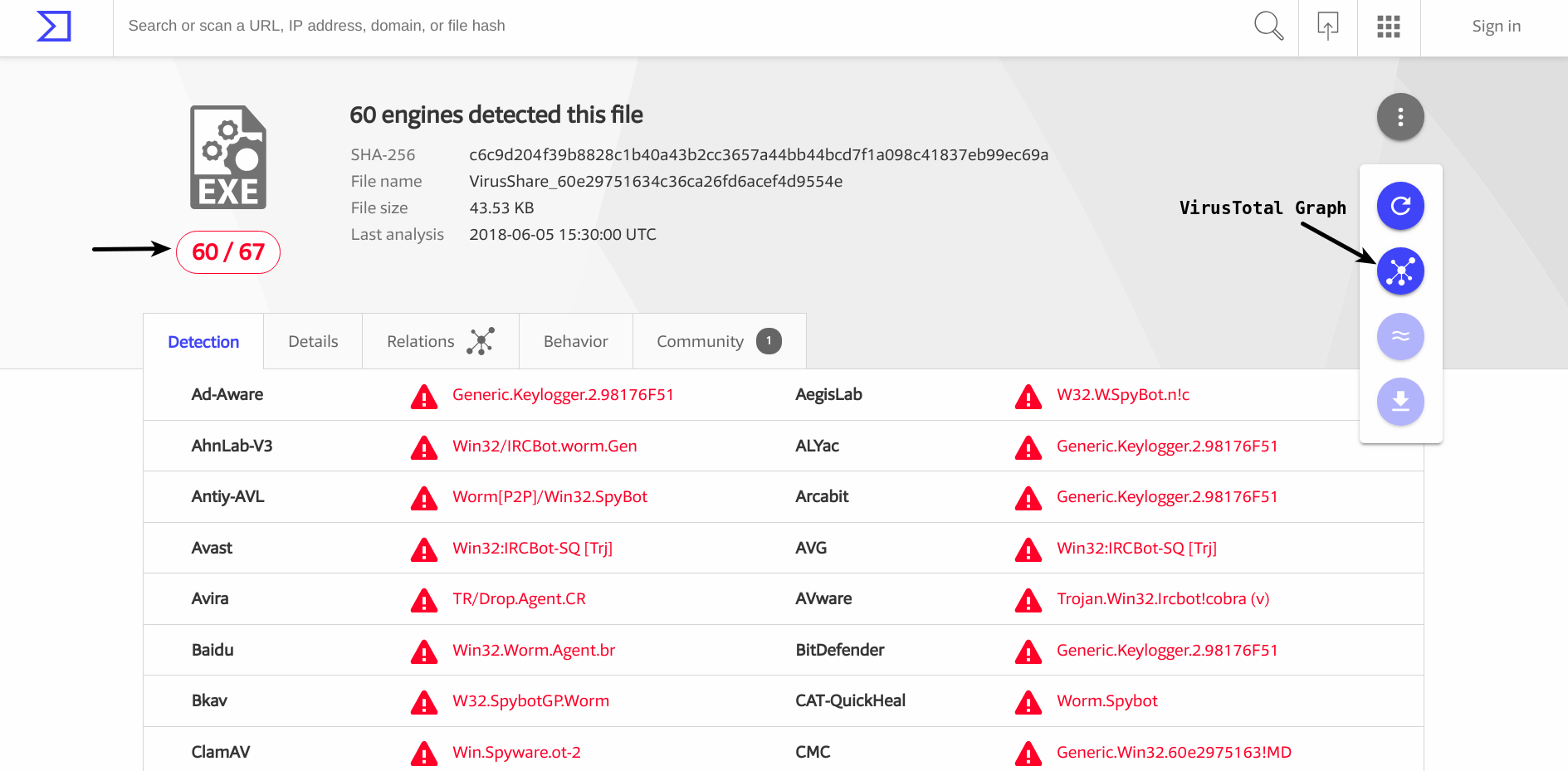The following screenshot shows the detection names for a malware binary, and it can be seen that the binary was scanned with 67 Anti-virus engines; 60 of them detected this binary as malicious. If you wish to use the VirusTotal Graph on the binary to visualize indicator relationships, just click on the VirusTotal Graph icon and sign in with your VirusTotal (community) account:
