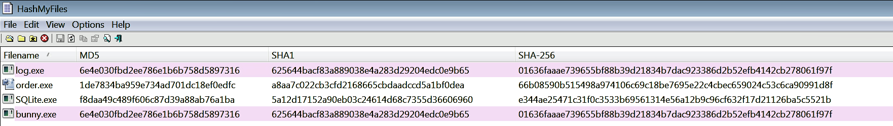 For Windows, various tools for generating file hashes can be found online. HashMyFiles (http://www.nirsoft.net/utils/hash_my_files.html) is one such tool that generates hash values for single or multiple files, and it also highlights identical hashes with same colors. In the following screenshot, it can be seen that log.exe and bunny.exe are the same samples based on their hash values: