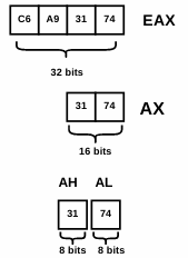 The x86 CPU has eight general purpose registers: eax, ebx, ecx, edx, esp, ebp, esi, and edi. These registers are 32 bits (4 bytes) in size. A program can access registers as 32-bit (4 bytes), 16-bit (2 bytes), or 8-bit (1 byte) values. The lower 16 bits (2 bytes) of each of these registers can be accessed as ax, bx, cx, dx, sp, bp, si, and di. The lower 8 bits (1 byte) of eax, ebx, ecx, and edx can be referenced as al, bl, cl, and dl. The higher set of 8 bits can be accessed as ah, bh, ch, and dh. In the following diagram, the eax register contains the 4-byte value 0xC6A93174. A program can access the lower 2 bytes (0x3174) by accessing the ax register, and it can access the lower byte (0x74) by accessing the al register, and the next byte (0x31) can be accessed by using the ah register: