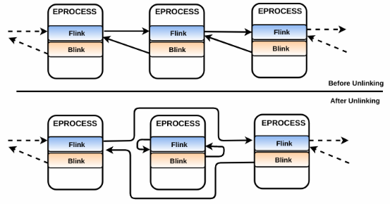 DKOM is a technique that involves modifying the kernel data structures. Using DKOM, it is possible to hide a process or a driver. To hide a process, an attacker finds the _EPROCESS structure of the malicious process he/she wants to hide and modifies the ActiveProcessLinks field. In particular, the Flink of the previous _EPROCESS block is made to point to the Flink of the following _EPROCESS block, and the Blink of the following _EPROCESS block is set to point to the previous _EPROCESS block's Flink. As a result of this, the _EPROCESS block associated with the malware process is unlinked from the doubly linked list (as shown here):