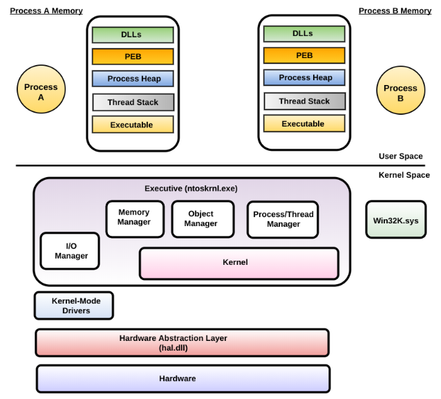 - Win32K.sys: This kernel mode driver implements UI and graphics device interface (GDI) services, which are used to render graphics on output devices (such as monitors). It exposes functions for GUI applications.