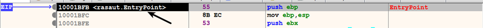 Next, reopen the debugger and load rundll32.exe again; when you load it again, the previous command-line settings will still be intact. Now, select Debug | Run (F9), till you break at the entry point of the DLL (you may have to select Run (F9) multiple times, till you reach the DLL entry point). You can keep track of where the execution has paused every time you run (F9), by looking at the comment next to the breakpoint address. You can also find the same comment next to the eip register. In the following screenshot, you can see that the execution has paused at the entry point of rasaut.dll. At this point, you can debug the DLL like any other program. You can also set breakpoints on any function exported by the DLL. You can find the export functions by using the Symbols window; after you have found the desired export function, double-click on it (which will take you to the code of the export function in the disassembly window). Then, set a breakpoint at the desired address: