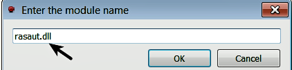 Next, select the Breakpoints tab, right-click inside the Breakpoints window, and choose the Add DLL breakpoint option, which will bring up a dialog window prompting you to enter the module name. Enter the DLL name (in this case, rasaut.dll), shown as follows. This will tell the debugger to break when the DLL (rasaut.dll) is loaded. After configuring these settings, close the debugger:
