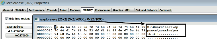 The following screenshot shows the content of the address 0x2270000 in Internet Explorer's process memory (this was passed as the 3rd argument to QueueUserAPC()); this address contains the full path to the DLL that was previously written by the malware: