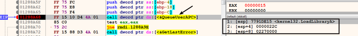 - The malware process then calls QueueUserAPC() to queue the APC function in the Internet Explorer thread's APC queue. In the following screenshot, the 1st argument to QueueUserAPC() is the pointer to the APC function that the malware wants the target thread to execute. In this case, the APC function is the LoadLibrary() whose address was determined previously. The 2nd argument, 0x22c, is the handle to the target thread of iexplore.exe. The 3rd argument, 0x2270000, is the address in the target process (iexplore.exe) memory containing the full path to the malicious DLL; this argument will automatically be passed as the parameter to the APC function (LoadLibrary()) when the thread executes it: