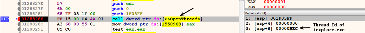 - It opens a handle to the thread of the target process using the OpenThread() API. In the following screenshot, the 3rd argument, 0xBEC(3052), is the thread ID (TID) of the iexplore.exe process. The return value of OpenThread() is the handle to the thread of iexplore.exe: