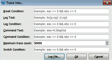Tracing allows you to log events while the process is executing. x64dbg supports trace into and trace over conditional tracing options. You can access these options via Trace | Trace into (Ctrl+Alt+F7) and Trace | Trace over (Ctrl+Alt+F8). In trace into, the debugger internally traces the program by setting step into breakpoint, until a condition is satisfied or the maximum number of steps is reached. In trace over, the debugger traces the program by setting step over breakpoint, until the condition is satisfied or the maximum number of steps is reached. The following screenshot shows the Trace into dialog (the same options are provided in the Trace over dialog). To trace the logs, at a minimum, you need to specify the log text and the full path to the log file (via the Log File button) where the trace events will be redirected: