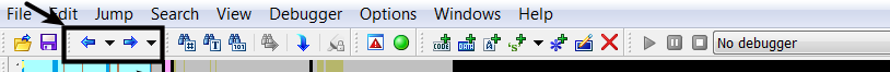 IDA keeps track of your navigation history; any time you navigate to a new location and would like to go back to your original position, you can use the navigation buttons. In the preceding example, to go back to the disassembly window, simply use the backward navigation button, as shown in the following screenshot: