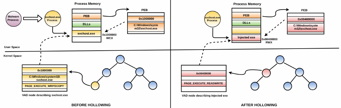 The following screenshot shows the discrepancy before and after hollowing. To be specific, the PEB after hollowing thinks that svchost.exe is loaded at 0x00400000. The VAD node that previously represented svchost.exe (loaded at 0x1000000) is no longer present, because when the malware hollowed out the svchost.exe process executable, the entry for that was removed from the VAD tree: