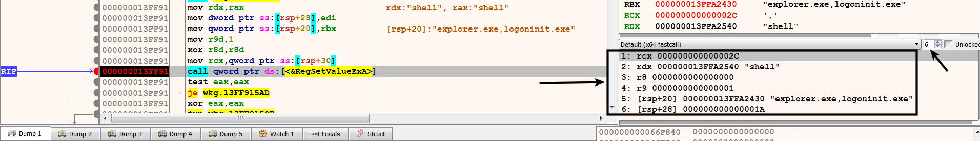 Let's look at an example of a 64-bit malware sample that calls RegSetValueEx to set some value in the registry. In the following screenshot, the breakpoint is triggered before the call to the RegSetValueEx. You will need to look at the values in the registers and the stack window (as mentioned previously) to examine the parameters passed to the function; this will help you determine what registry value is set by the malware. In x64dbg, the easiest way to get a quick summary of function parameters is to look at the Default Window (below the registers window), which is highlighted in the following screenshot. You can set a value in the Default window to display the number of parameters. In the following screenshot, the value is set to 6, because from the API documentation (https://msdn.microsoft.com/en-us/library/windows/desktop/ms724923(v=vs.85).aspx), you can tell that the RegSetValueEx API takes 6 parameters: