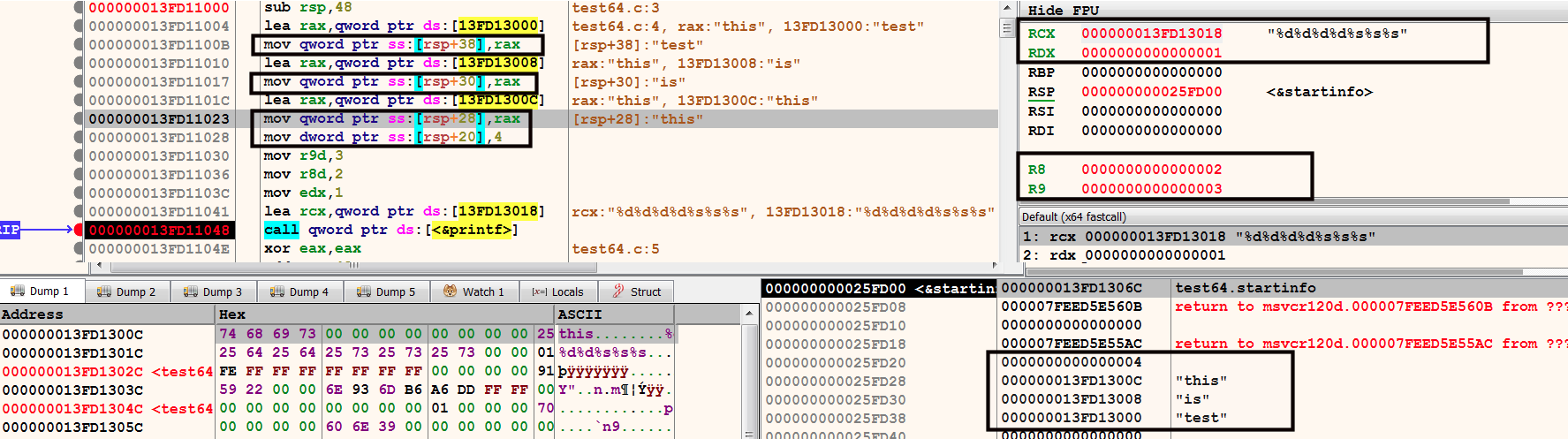In the preceding program, the printf function takes eight arguments; this program was compiled and opened in x64dbg, and a breakpoint was set at the printf function. The following screenshot shows the program, which is paused before the call to the printf function. In the registers window, you can see that the first four parameters are placed in the rcx, rdx, r8, and r9 registers. When the program calls a function, the function reserves 0x20 (32 bytes) of space on the stack (space for four items, each 8 bytes in size); this is to make sure that the called function has the necessary space, if it needs to save the register parameters (rcx, rdx, r8, and r9). This is the reason the next four parameters (the 5th, 6th, 7th, and 8th parameters) are placed on the stack, starting from the fifth item (rsp+0x20). We are showing you this example to give you an idea of how to find the parameters on the stack: