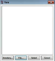 The x64dbg integrates YARA; this is useful if you wish to scan for the crypto signatures in a binary while debugging. You can load the binary into x64dbg (make sure the execution is paused somewhere in the binary), then right-click on the CPU window and select YARA (or Ctrl + Y); this will bring up the Yara dialog shown here. Click on File and loacte the file containing YARA rules. You can also load multiple files containing YARA rules from a directory by clicking on the Directory button: