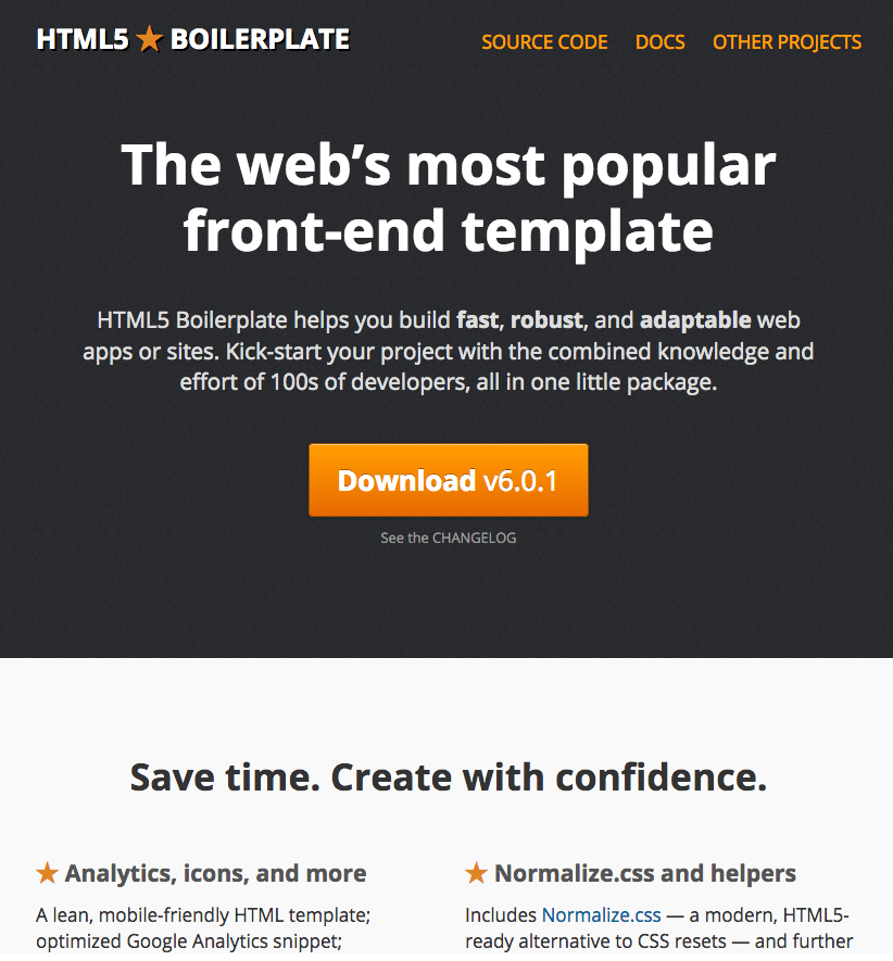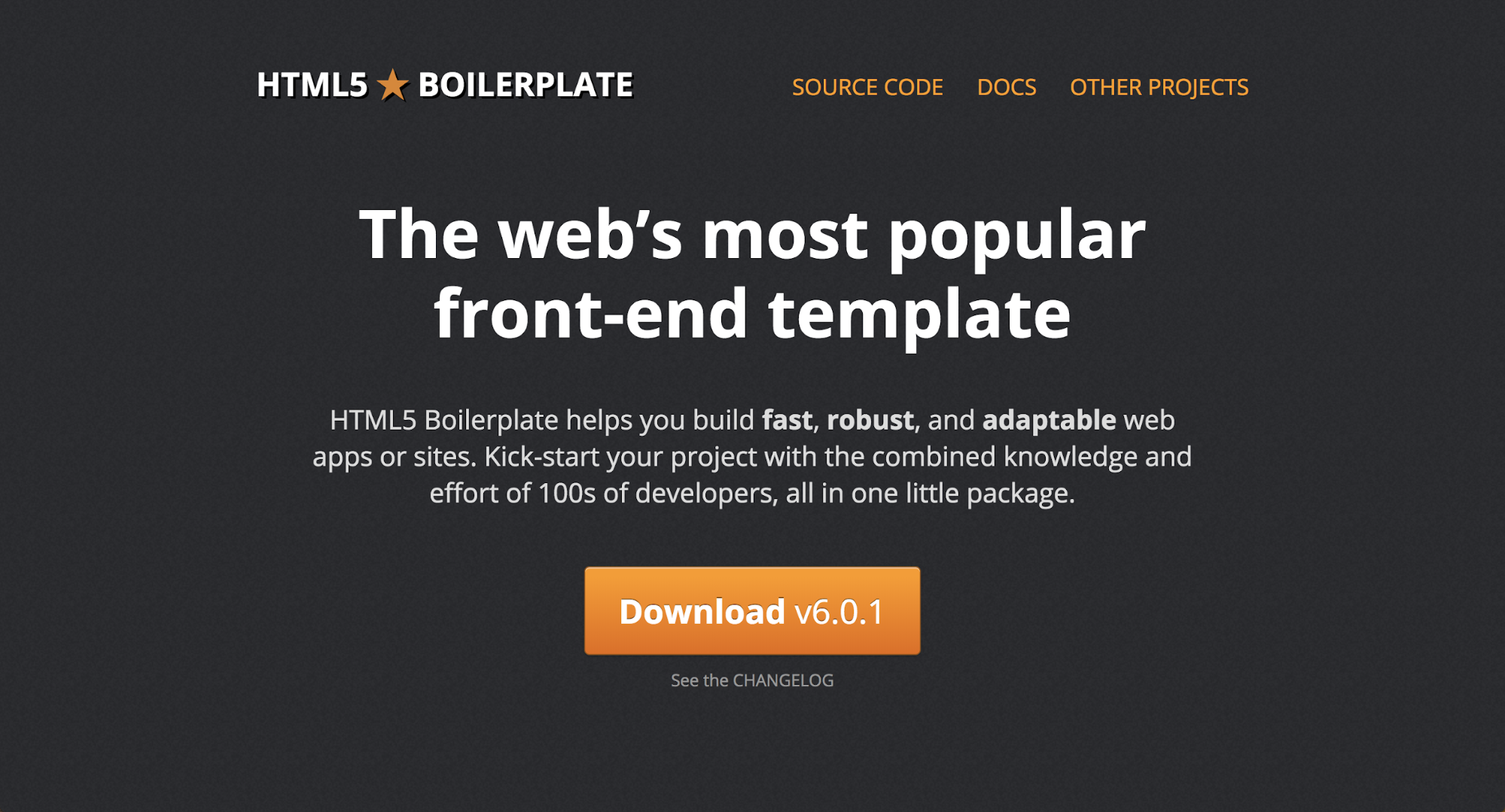 HTML BoilerplateWhether you'd like to build websites or apps, you can use HTML5 Boilerplate to save time without compromising on performance.