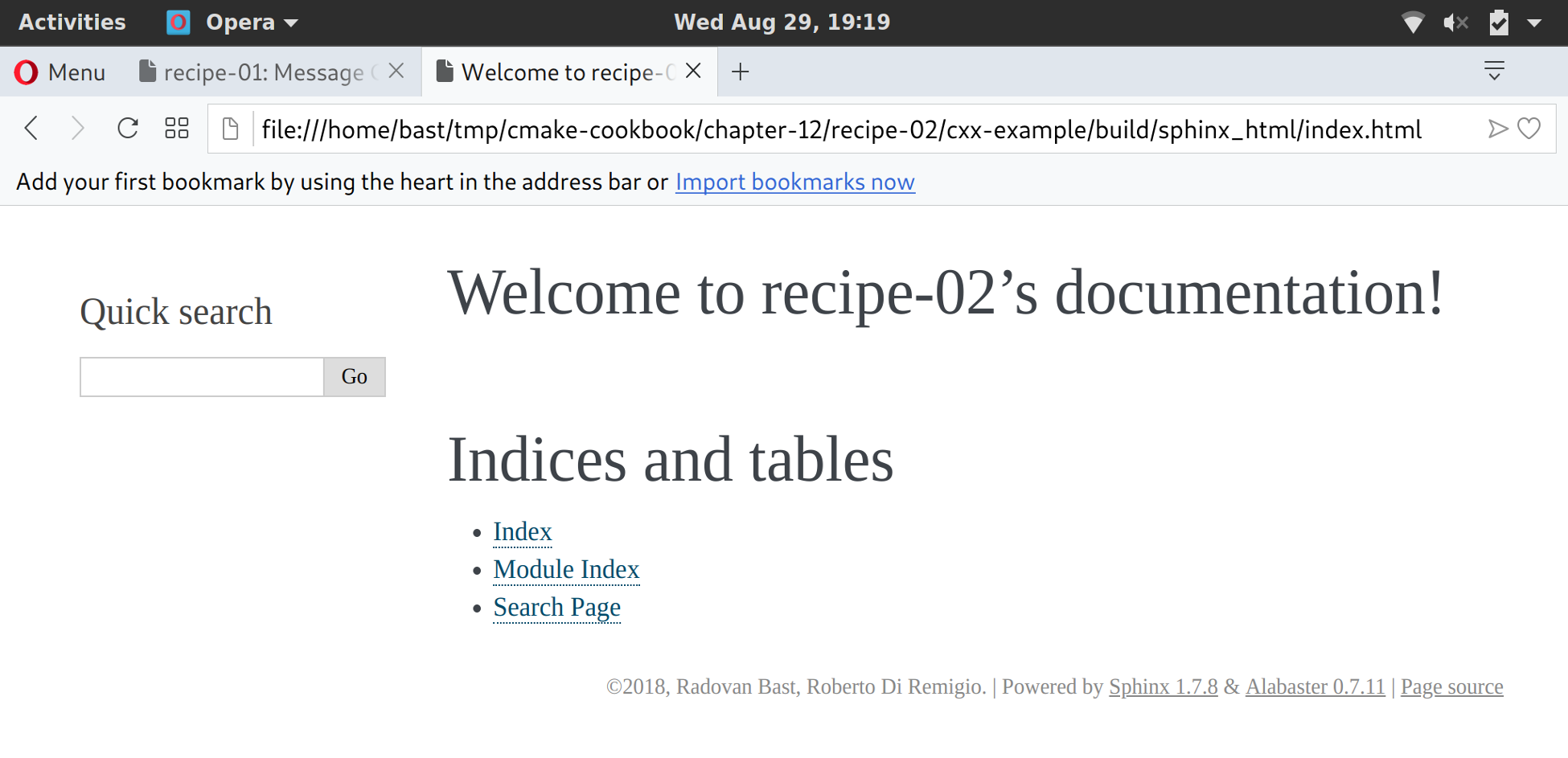 This will produce the HTML documentation in the SPHINX_DOC_HTML_DIR subdirectory of the build tree. Once again, you can use your favorite browser to open index.html and see the shiny (but still sparse) documentation: