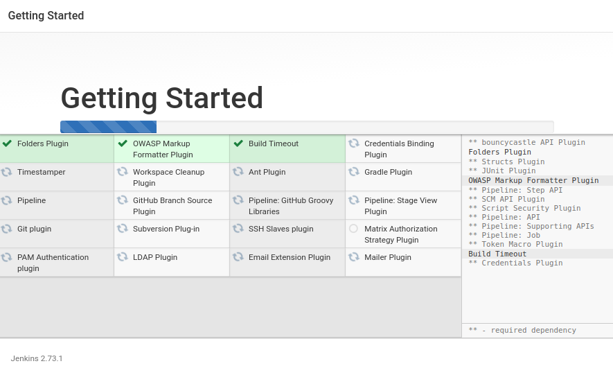 Pick Install suggested plugins to install the most commonly used plugins, including the Git and GitHub plugins we will use later. You can track the progress of the installation on the next screen: