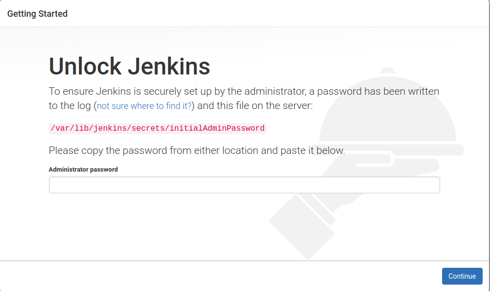 Therefore, the first step is to copy the contents of the /var/lib/jenkins/secrets/initialAdminPassword file and paste it into the wizard: