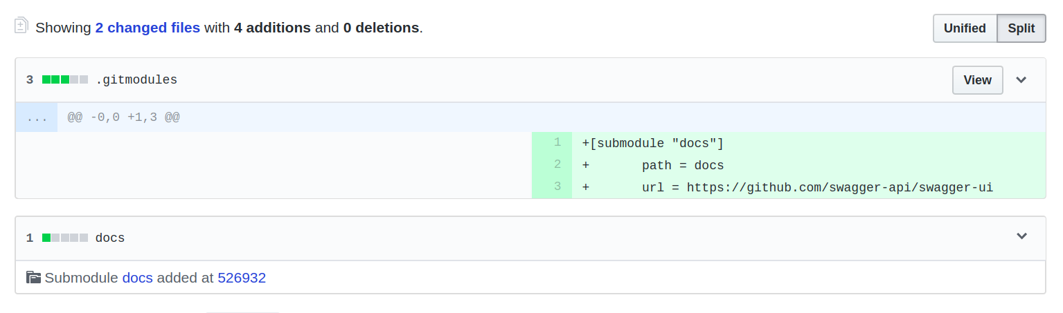 Locally, this will download the entire contents of the Swagger UI repository and save it into the docs/ directory at the root of your project. However, in Git, only the .gitmodules file and a small docs file is tracked: