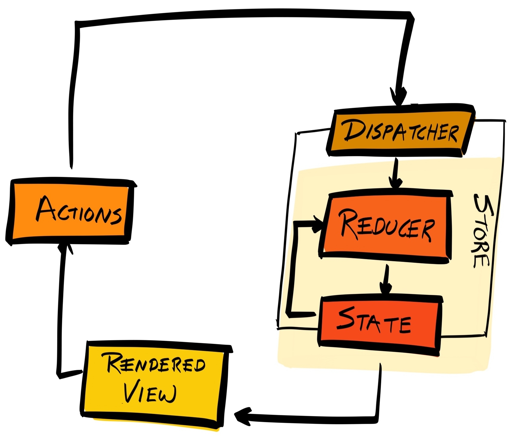 In Redux, you keep the state of your application inside an object literal that belongs to a store. When the state needs to be changed, an action describing what has happened should be emitted.