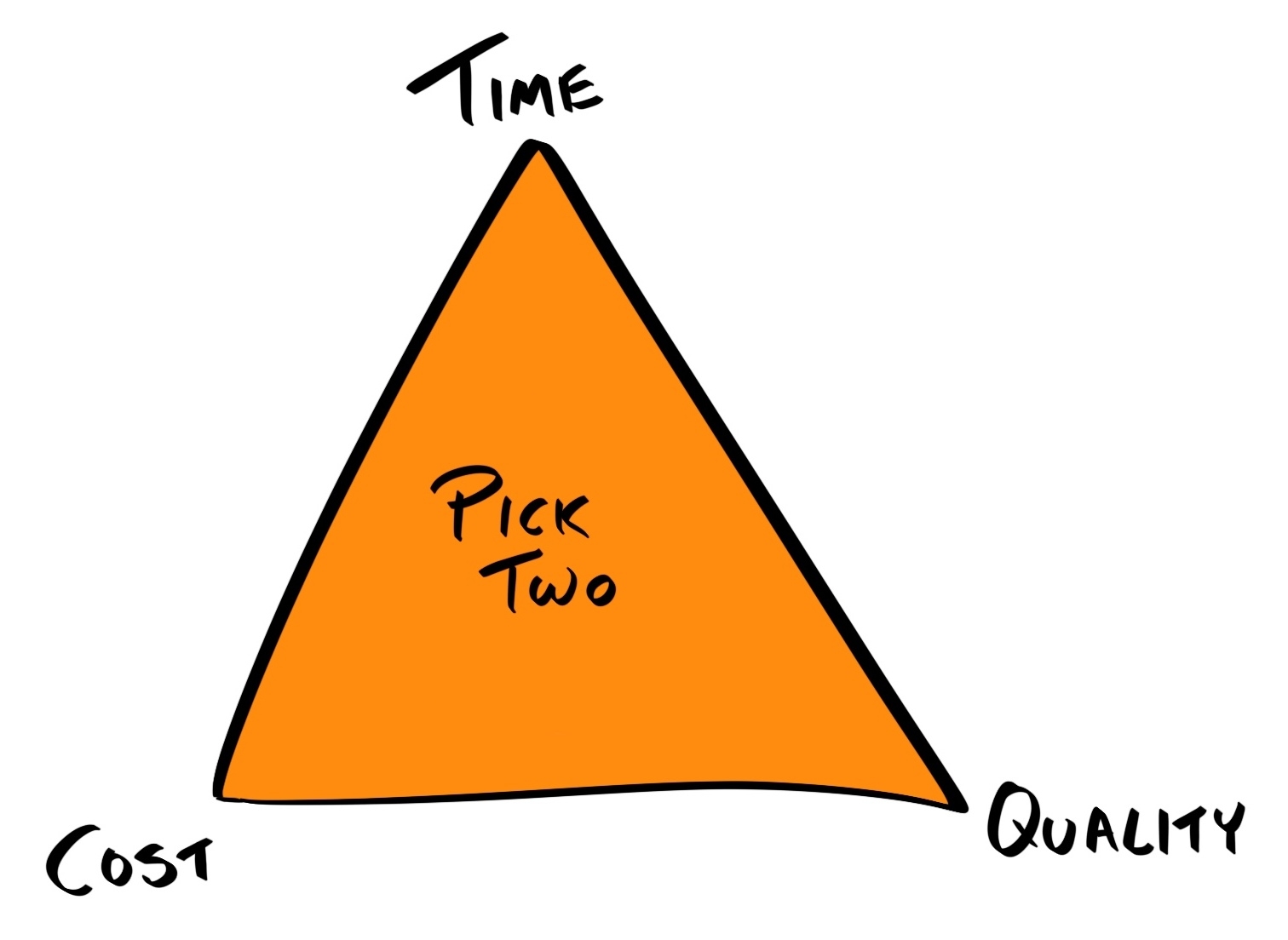 The classic project management triangle (also known as triple constraint or the iron triangle) coined the popular saying Time, Quality, Cost. Pick two. The triangle is shown as follows: