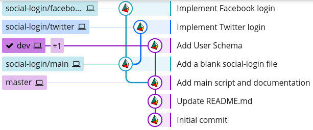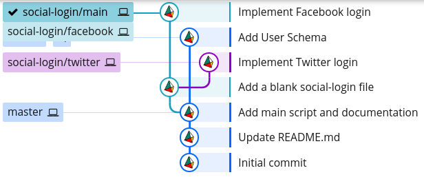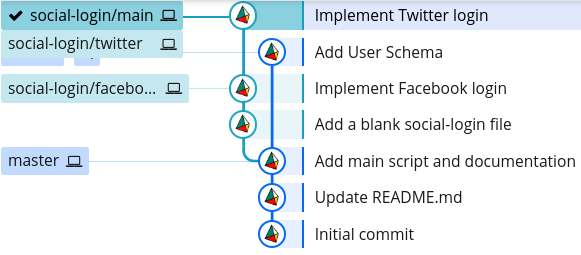 Now, we have a completely linear commit history on the social-login/main branch, even though they all originated from different branches: