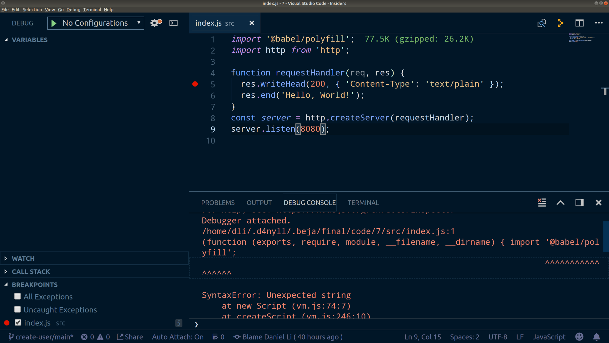 The debugger throws an error because it doesn't recognize the ES6 modules' import syntax. This is because we are running the debugger on the source file directly, instead of the compiled file produced by Babel. To instruct VSCode to process modules, we can do one of two things:
