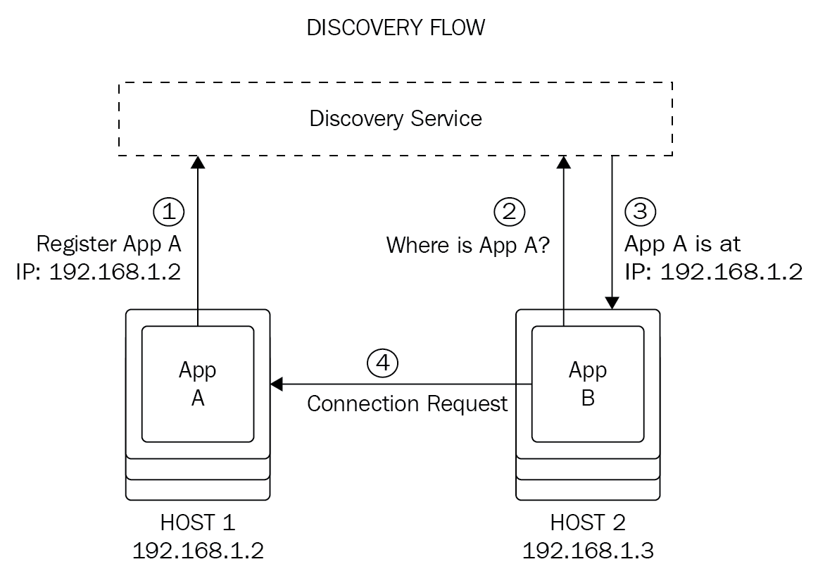 When a new service is initiated, it will query the Discovery Service to request information about the services it needs to connect with, such as their IP address. Then, the Discovery Service will retrieve this information from its key-value store and return it to the new service: