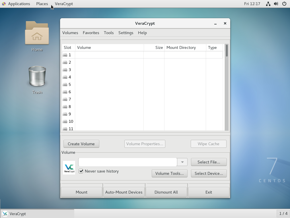 Desktop users of any of the supported operating systems can install the GUI variant of VeraCrypt. Be aware though, that you can't install both the console-mode variant and the GUI variant on the same machine, because one will overwrite the other. Here, you see the GUI version running on my CentOS 7 virtual machine: