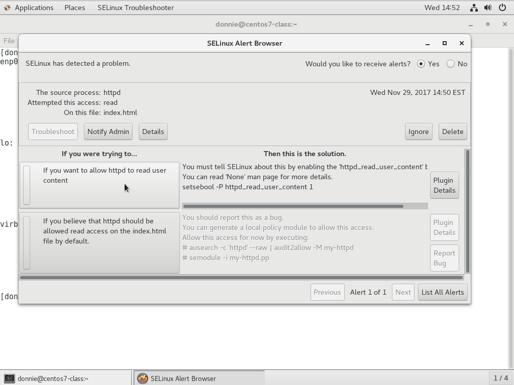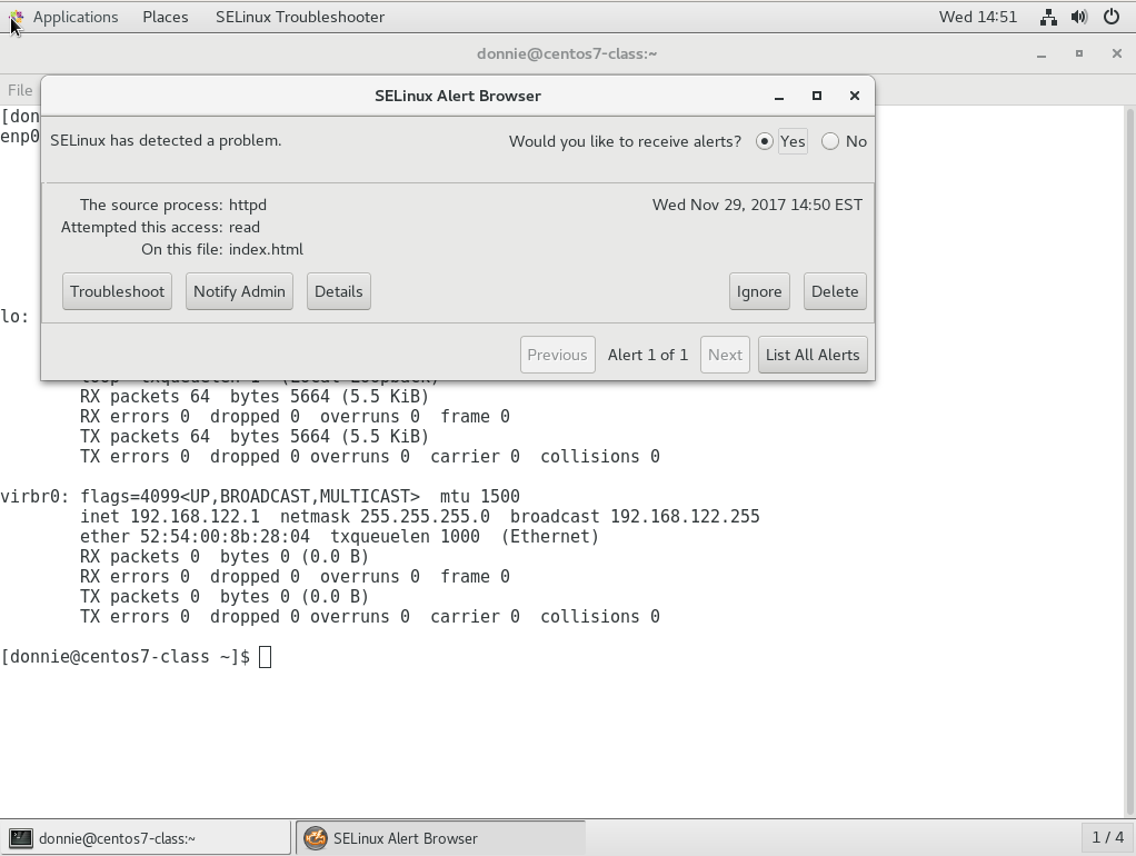 So far, I've only talked about using setroubleshoot on text-mode servers. After all, it's very common to see Linux servers running in text-mode, so all of us Linux folk have to be text-mode warriors. But on desktop systems or on servers that have a desktop interface installed, there is a graphical utility that will automatically alert you when setroubleshoot detects a problem: